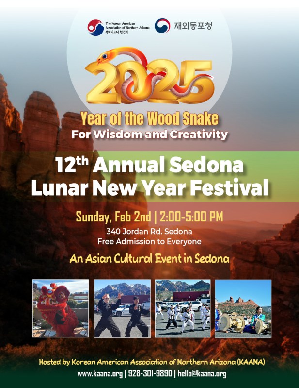 북부 애리조나 한인회(KAANA)는 2025년 2월 2일 일요일 오후 2시부터 5시까지 세도나의 340 Jordan Road (Sedona, AZ 86336)에서 열리는 제12회 설날 축제에 여러분을 초대합니다. 이번 축제는 “목(木)의 뱀” 을사년을 기념하며, 풍성한 문화적 경험과 다양한 공연들로 여러분을 맞이할 예정입니다.