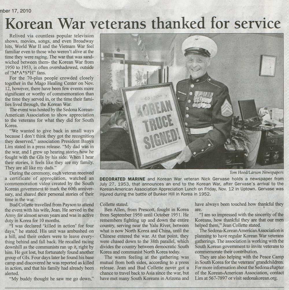 Korean War Veterans Appreciation Day on the Red Rock News, Nov 17, 2010 Posted on 11/17/2010 by Sedona Korean Share this: Click to share on Facebook (Opens in new window) Facebook Click to share on X (Opens in new window) X Like Loading...