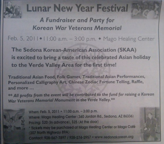 The Sedona Korean-American Association (SKAA) is excited to bring a taste of this celebrated Asian holiday to Sedona for the first time. On February 5th, the Association is proud to host the ‘Lunar New Year Festival’, open to all Sedona residents. The Festival will celebrate the Lunar New Year as well as double as a fund-raiser for one of the SKAA’s main goals: raising a Korean War Veterans Memorial Monument in the Verde Valley.